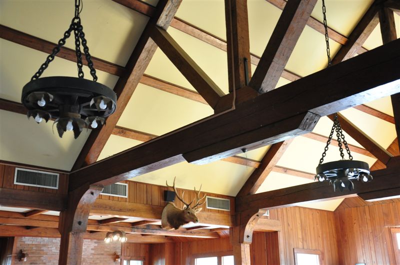 Once the sidewalk ended, our group continued following the lake toward the main lodge, where we all took a break for the kids to play the old-fashioned pin-ball machine and video games. With its exposed beams and large fireplace, the lodge, although underutilized, is a beautiful testament to the work of the CCC. Our self-made trail continued through the woods to the playground, passing a raised pipe along the way that has served as a balance beam for as long as I can remember.